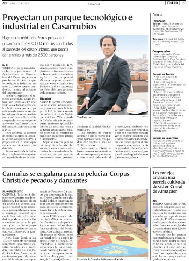 Notícia del diario ABC dónde se habla del proyecto del parque tecnológico e industrial en Casarrubios del Monte, con un desarrollo de 2.200.000 metros cuadrados y dónde se van a generar 2.500 empleos.